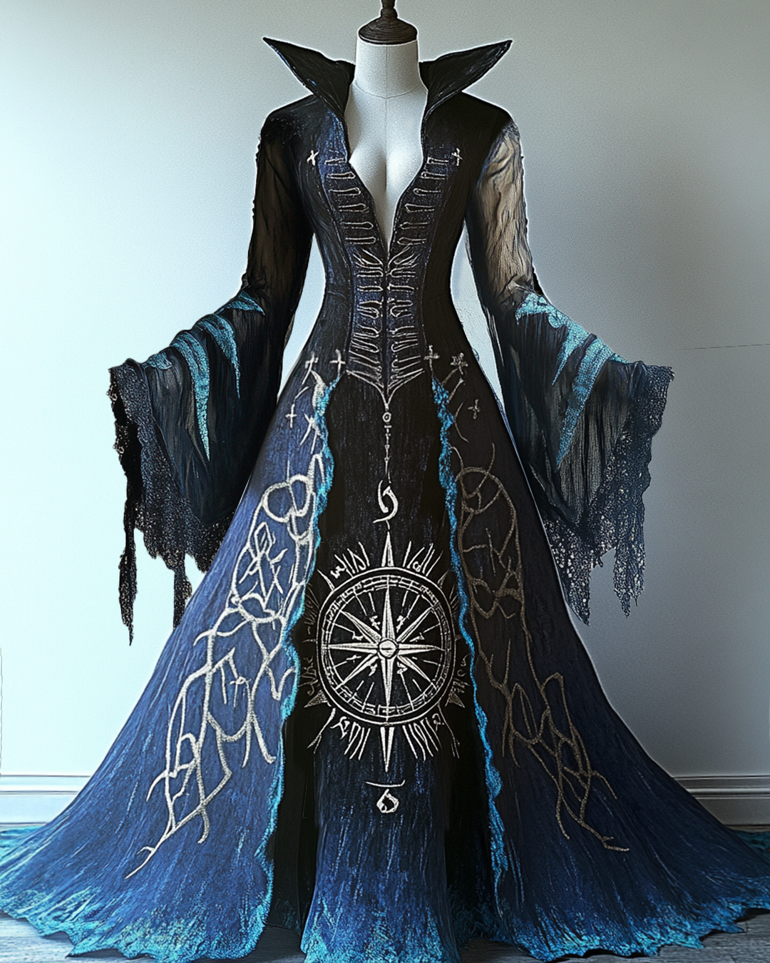 Witch-Themed Gradient Compass Rune Embroidered Lace-Patchwork Linen Dress 4205