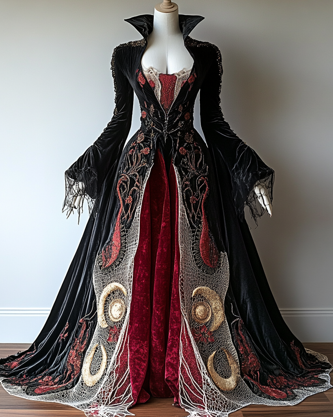 Witch-Themed Gradient Sun-Moon Embroidered Lace-Patchwork Velvet Dress 6089