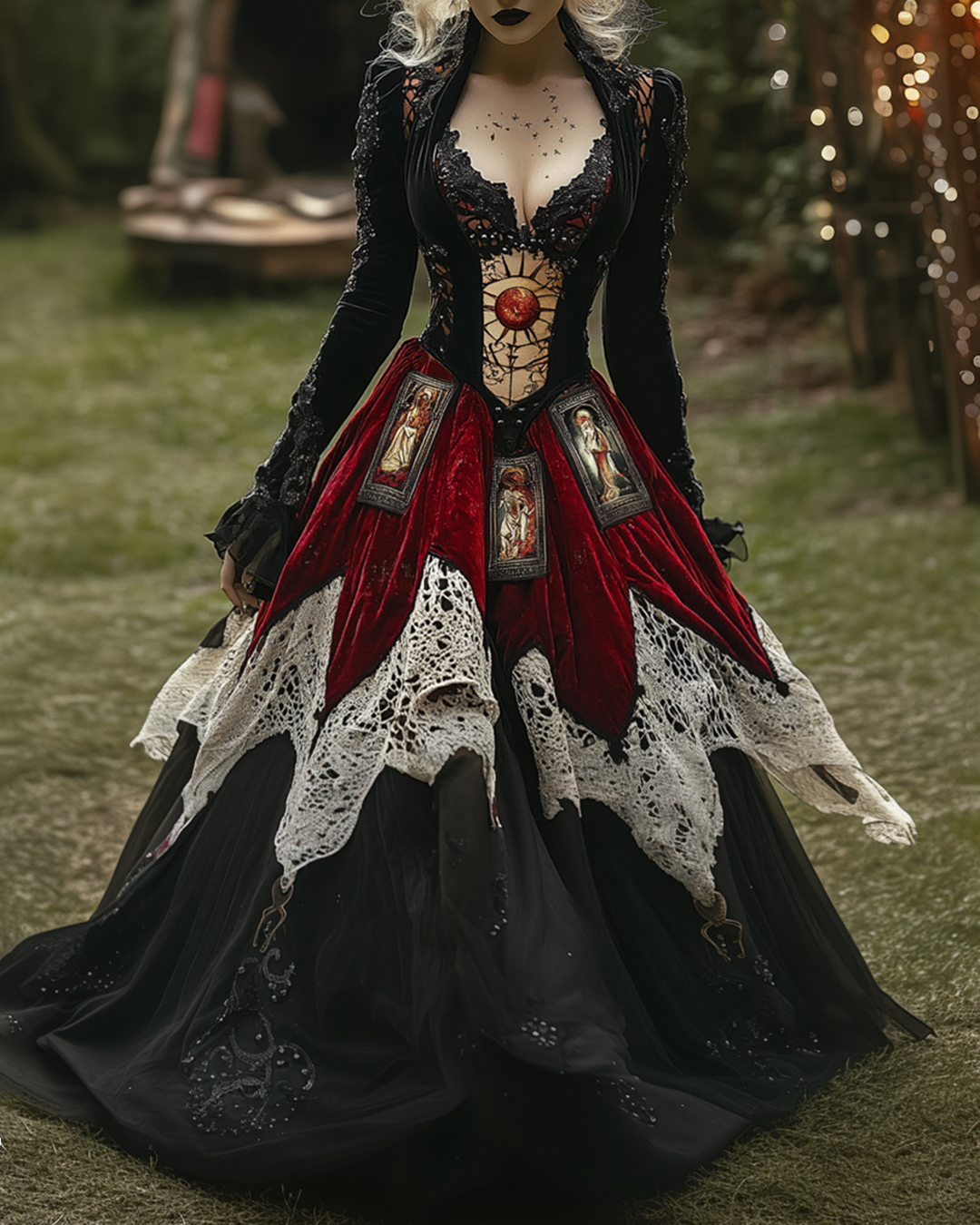 Witch-Themed Contrast-Color Tarot Embroidered Lace Patchwork Velvet Dress 6437
