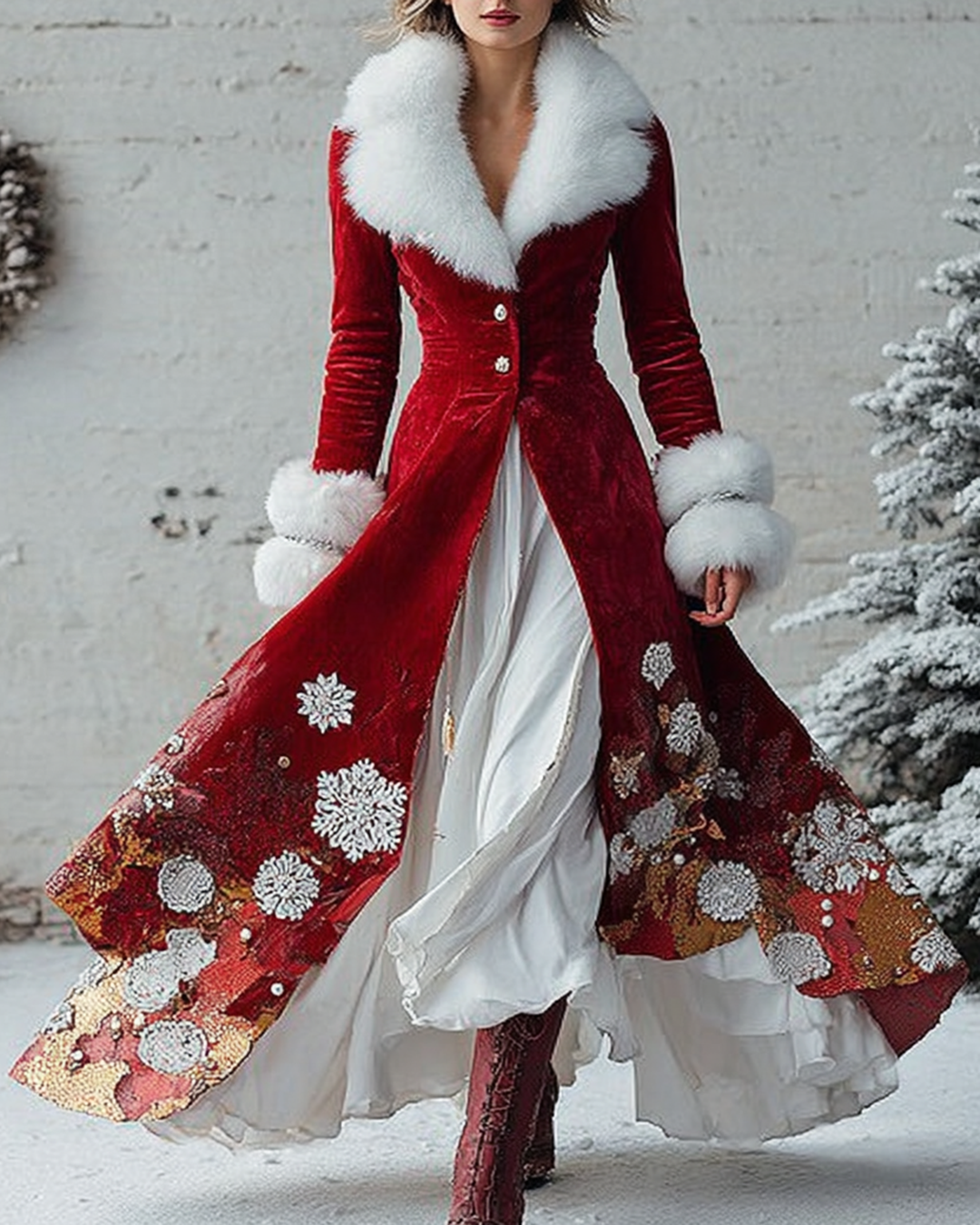 Women's Christmas-Themed Contrasting Color Snowflake Beaded Embroidered Velvet Dress 3063