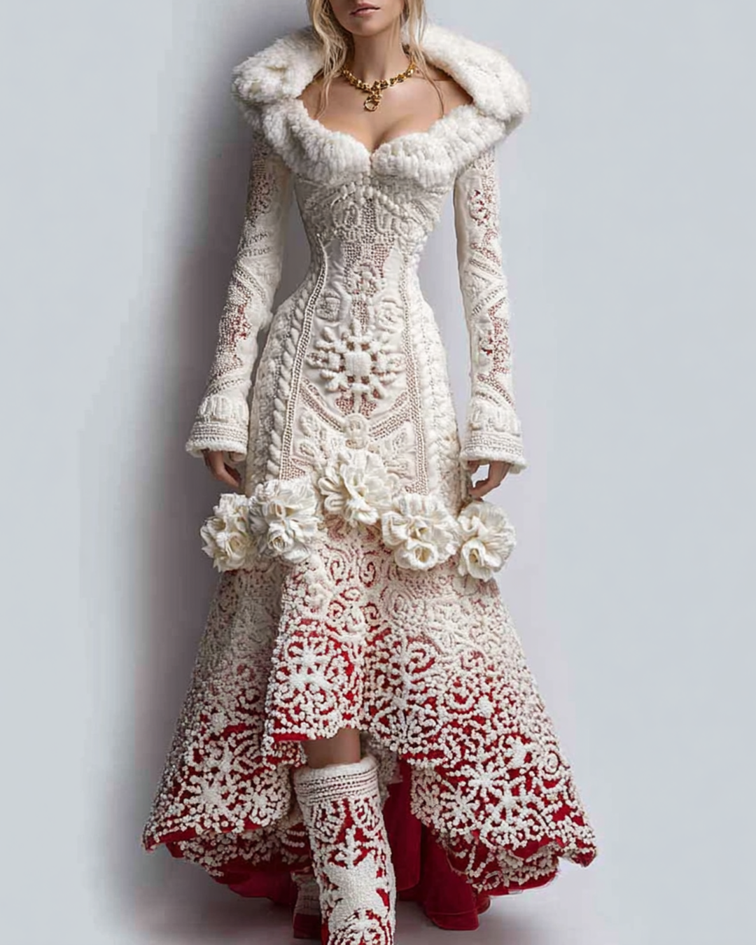 Women's Christmas-Themed Gradient Snowflake Crochet Patchwork Irregular Fur Collar Dress 3714
