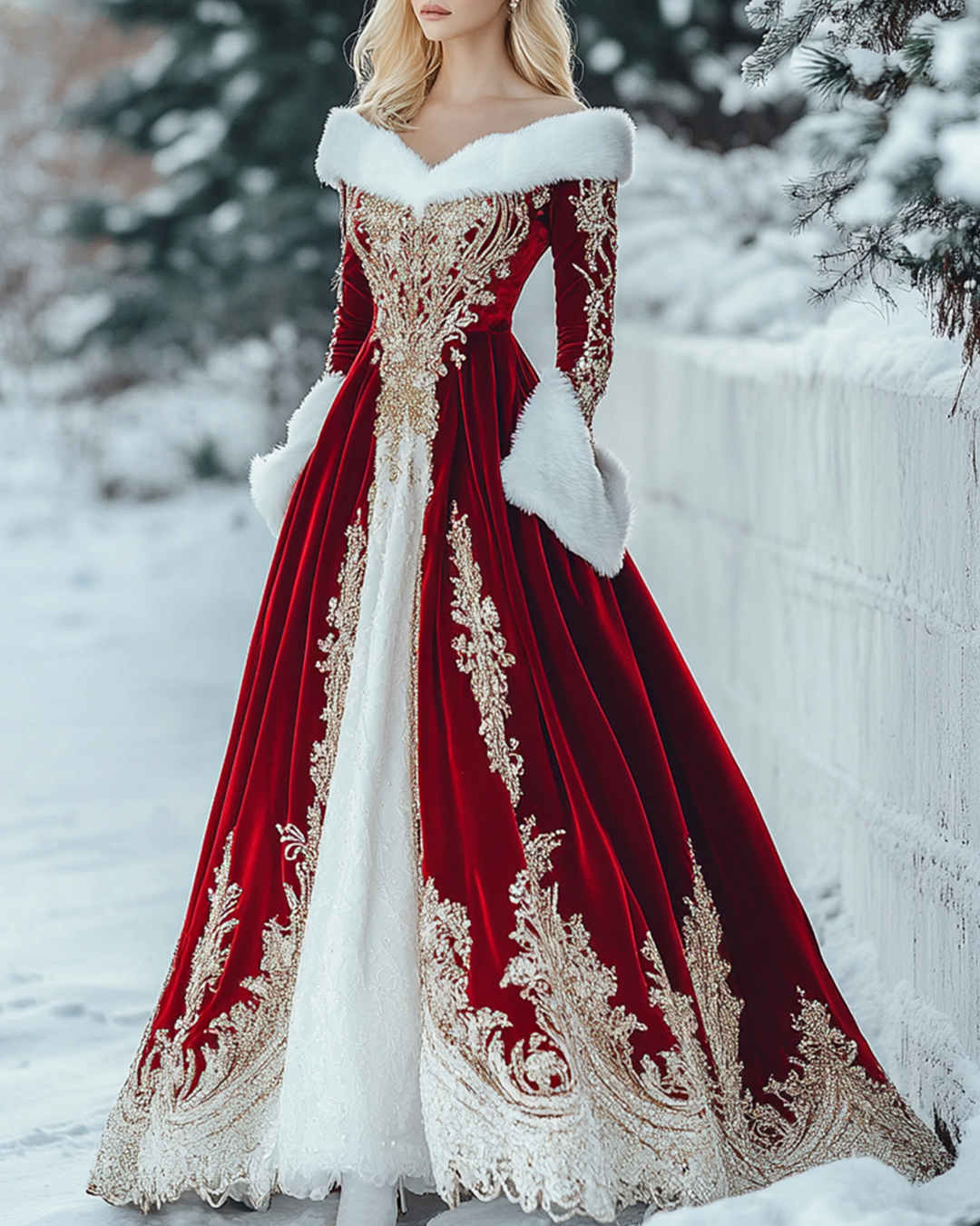 Women's Christmas-Themed Contrasting Color Beaded Embroidered Velvet Dress 4070