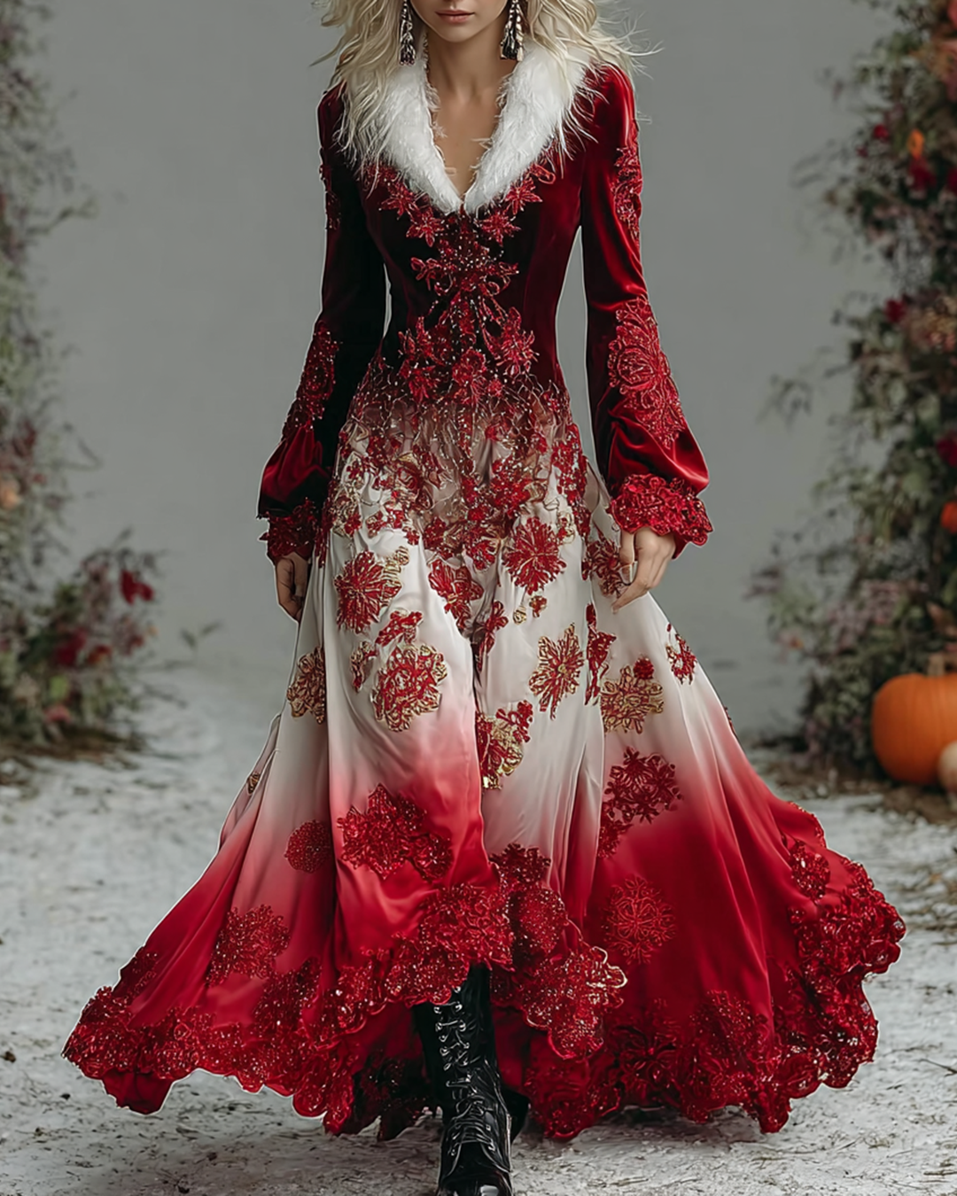 Women's Christmas Themed Snowflake Embroidered Lace Patchwork Fur Collar Dress 4385
