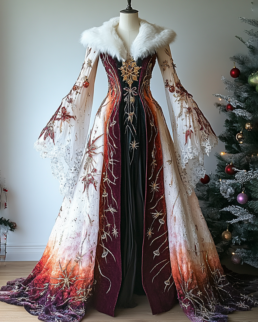 Women's Christmas-Themed Gradient Snowflake Embroidered Velvet Fur Collar Dress 5075