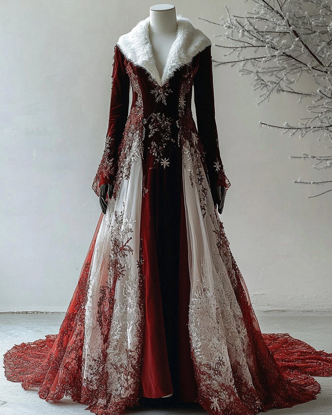Christmas-Themed Gradient Snowflake Lace Patchwork Velvet Fur Collar Dress 5346