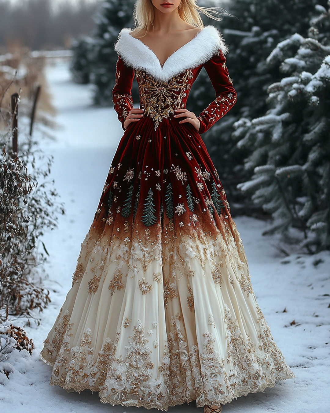 Women's Christmas-Themed Contrasting Color Beaded Embroidered Velvet Dress 6496