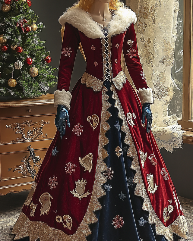 Women's Christmas themed embroidered contrasting color-blocked dress 5664