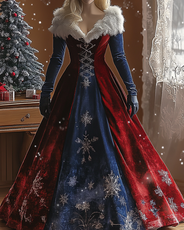 Women's Christmas themed snowflake embroidery contrast color stitching dress 8654