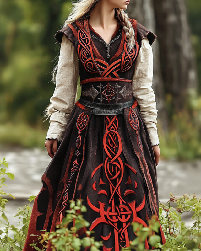 Women's Viking Celtic Knot Embroidery Art Comfort Leather Panel Dress 7713